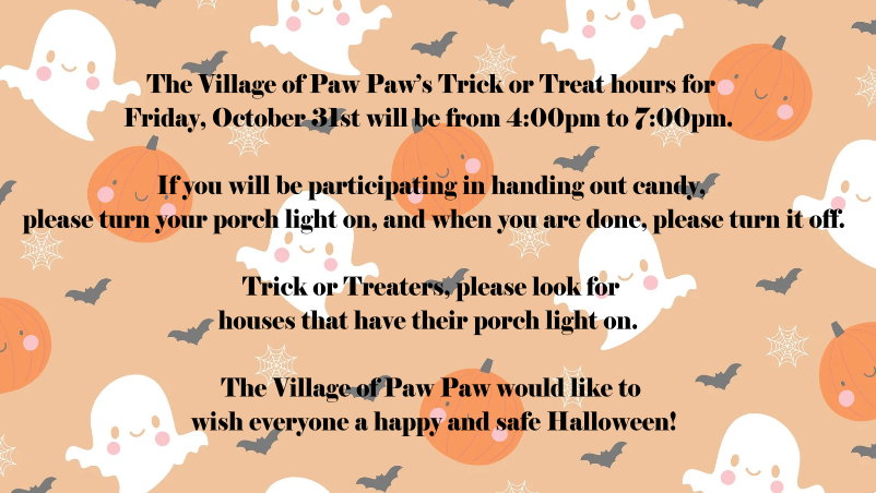 Village of Paw Paw’s Office Hours: Monday, Wednesday, Thursday, Friday – 8am to Noon Tuesday – 1:30pm to 6pm